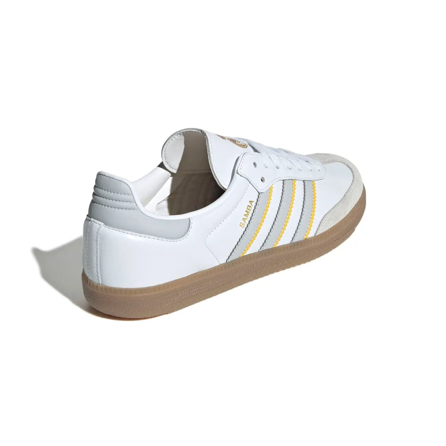 Created so Real Madrid fans can roll with soccer style off the pitch. An adidas footwear icon, the Samba is famous for its soft leather upper and suede T-toe. This pair is finished in Real Madrid's famous home colors and shows off a team crest on the heel tab so no one can mistake your soccer fandom.